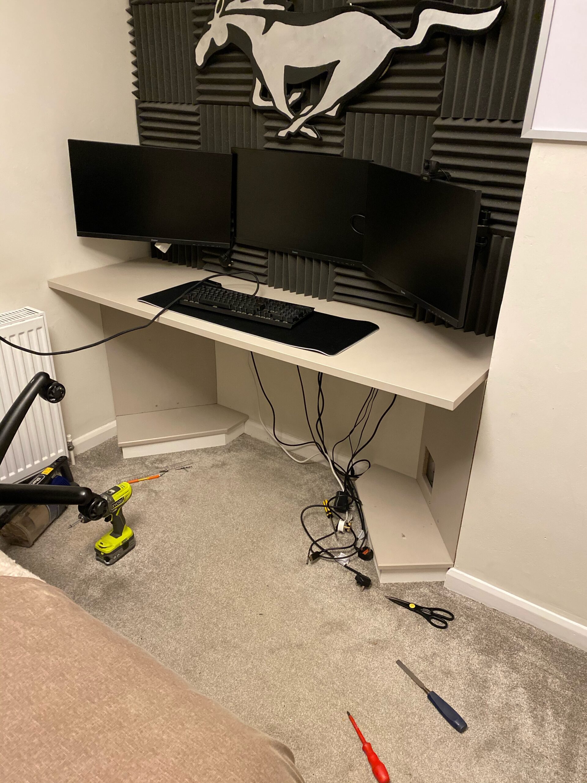 The table top is now made of a much stiffer MDF board, with less flex that the previous one. All wordbook is colour match painted to suit the room and cabling is better routed for a cleaner and clearer space – much tidier 🙂